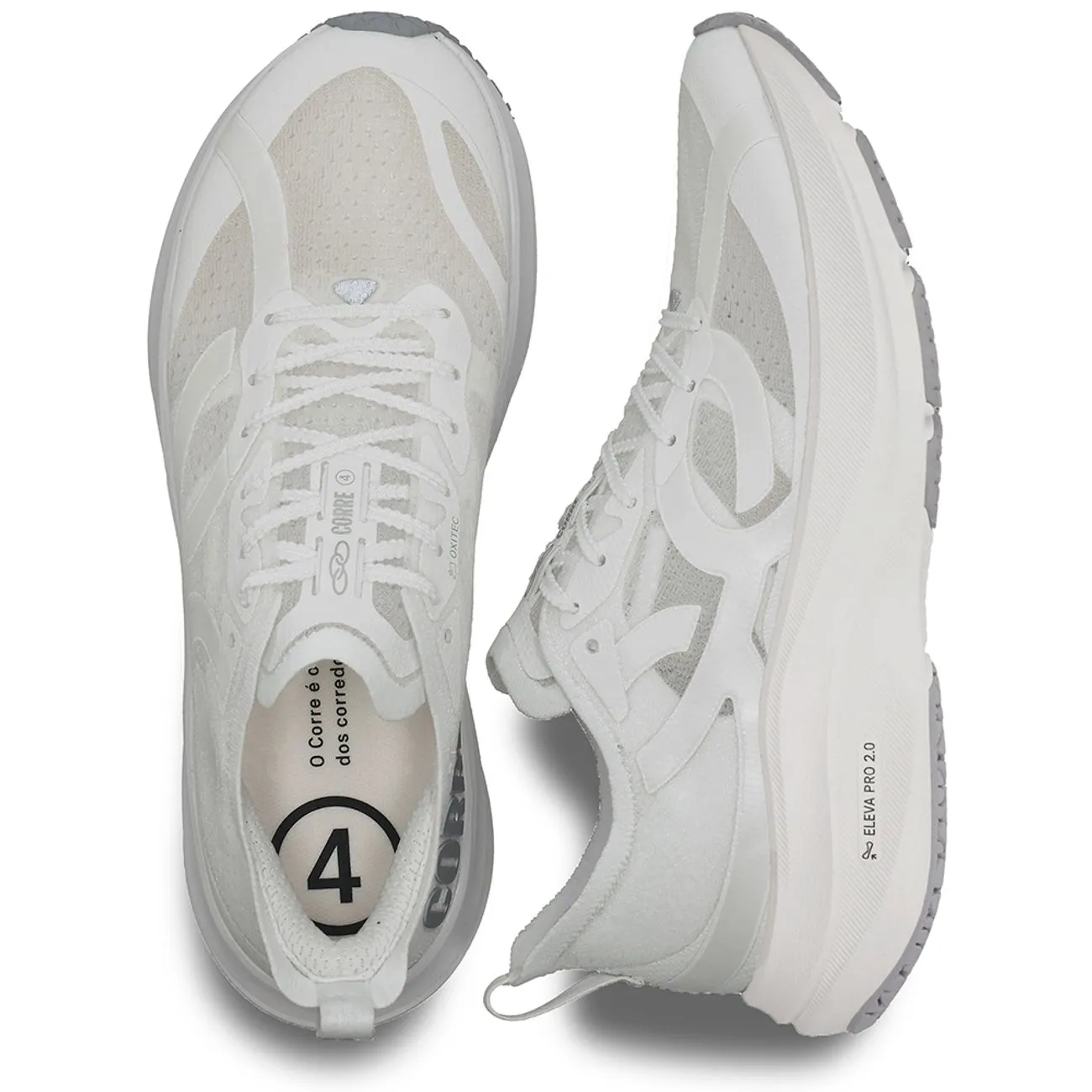 O tênis feito por corredores brasileiros chega a sua quarta edição. Trazendo o equilíbrio perfeito entre estilo e performance, o Corre 4 possui tecnologia Eleva Pro 2.0, trazendo melhores índices de resiliência, conforto e responsividade. Conta também com a nova versão da borracha antiderrapante Gripper, que proporciona contato firme com o chão durante toda a corrida. Sua nova fórmula apresenta 40% mais durabilidade e 50% mais resistência ao deslizamento, elevando os níveis de performance. O cabedal e a lingueta, confeccionados com fios de monofilamento coloridos e poliéster, são a essência da tecnologia inovadora Oxitec 2.0, que proporciona maior leveza e respirabilidade, essenciais para o desempenho máximo. Já a palmilha é desenvolvida com a tecnologia NT-X, que consiste em uma palmilha plana, composta por poliéster e PEBAX. Ela traz 30% mais leveza, 42% mais durabilidade e melhor ajuste ao pé. Seu tecido de poliéster é resistente e tem pequenos perfuros para a garantia de maior respirabilidade. O logo Olympikus, aplicado em high frequency com material diferenciado de espessura mínima de 0,25mm, garante máxima resistência com peso mínimo. Além disso, contém forro em tecido poliéster com espuma e puxador traseiro em fita para facilitar o calce.